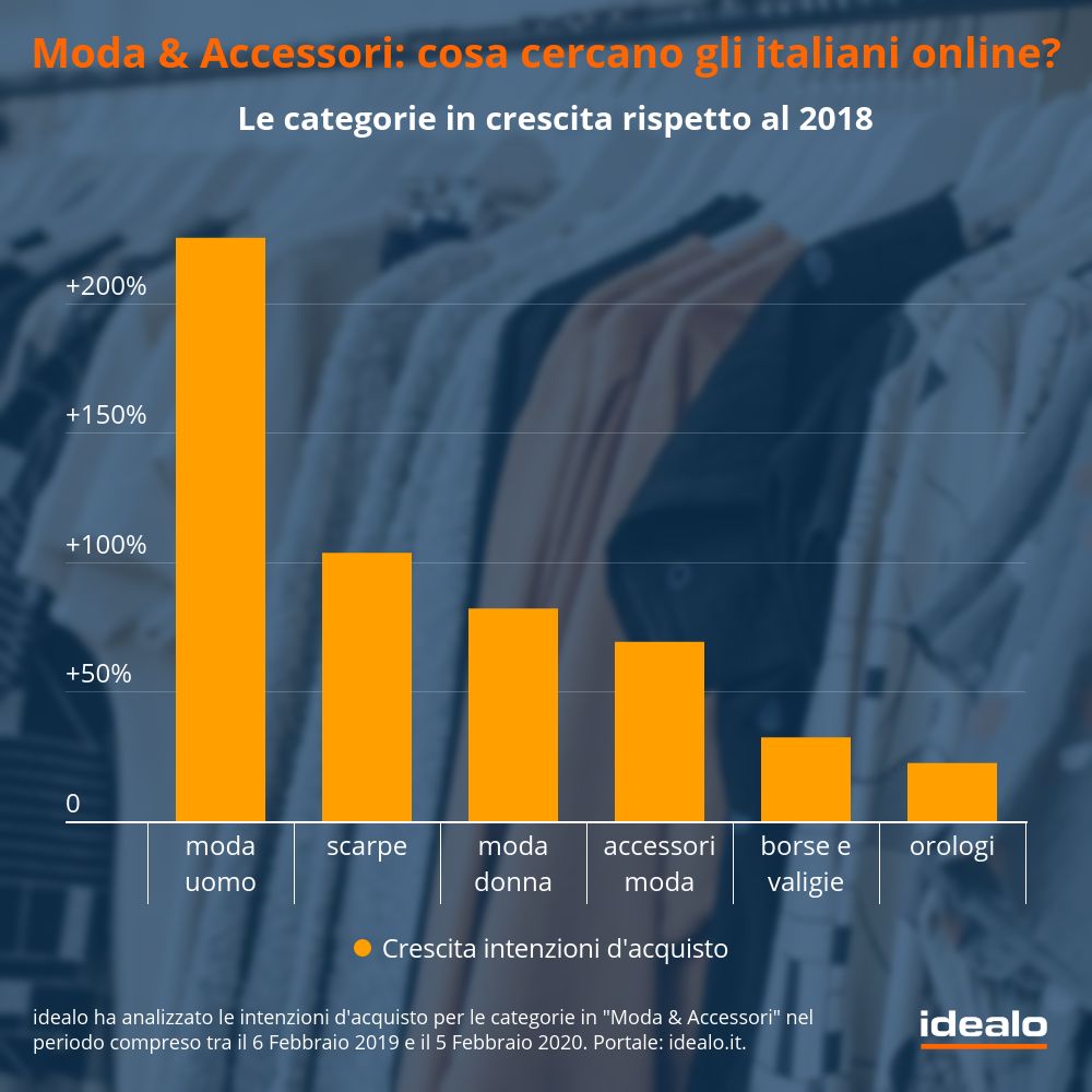 Secondo i dati analizzati da idealo gli articoli maggiormente cercati nell’ultimo anno, che hanno fatto registrare una crescita delle intenzioni di acquisto in Italia del +87,0%, sono stati scarpe, borse e valigie, moda uomo, orologi, accessori, moda donna e infine gioielli. Ma non solo, queste stesse categorie sono state anche quelle a maggiore crescita rispetto al 2018: moda uomo (+225,3%), scarpe (+103,7%), moda donna (+82,1%), accessori moda (+69,3%), borse e valigie (+32,4%) e orologi (+22,5%). I gioielli, invece, hanno vissuto una lieve decrescita delle intenzioni di acquisto: -8,3%.