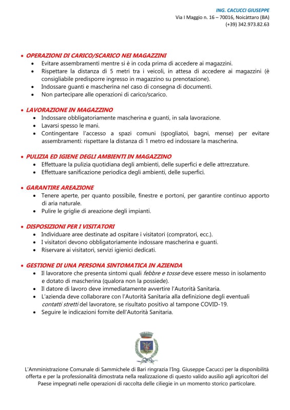 Per questo motivo ieri pomeriggio a Sammichele nel Centro Operativo Comunale si è svolta una riunione dove è stato presentato dall’Amministrazione comunale ai tanti agricoltori del centro dell’entroterra barese una sorta di vademecum comportamentale per portare avanti la propria attività durante la campagna cerasicola.
