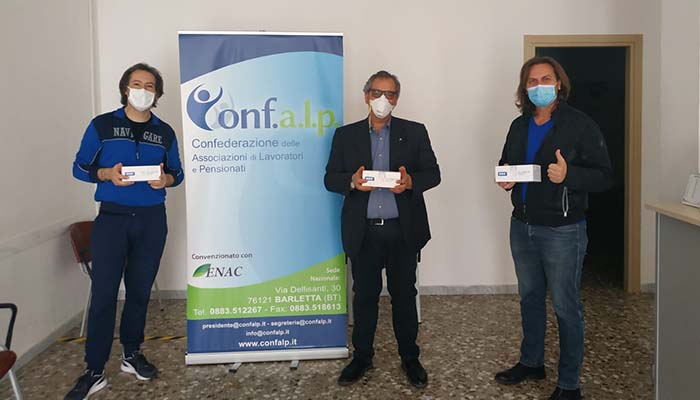 Tra i primi beneficiati delle mascherine chirurgiche le associazioni “Orizzonti”, rappresentata dal dottor Angelo Guariello; “Centro Zenit”, rappresentata dal prof. Antonello Fortunato; “ANT Andria”, rappresentata dal dott. Aldo Carnicella; “CONF. A.L.P. “, rappresentata da Michele Bartoli; Protezione Civile Bisceglie e infine all’associazione “Si può fare” di Andria.