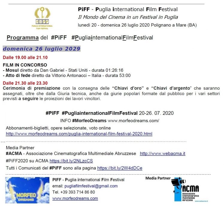 Sette giorni di Festival con incontri, dibattiti seguiti alle proiezioni delle opere selezionate, tra le oltre 200 pervenute; 14 lungometraggi di finzione, 19 docufilm e 34 cortometraggi e 34 cortometraggi. Non posso che rinnovarvi l’invito ad essere presenti per, insieme, celebrare la conclusione della prima edizione di questo progetto che abbiamo chiamato PiFF – Puglia international Film Festival e che ha portato l’intera regione Puglia all’attenzione dei media nazionali e internazionali oltre che coinvolgere autori, registi, operatori del mondo del cinema. Numerosi i vincitori che, contattati nella tarda mattinata, al termine anche dello spoglio dei voti sia on-line che delle giurie popolare, hanno annunciato la loro presenza”.