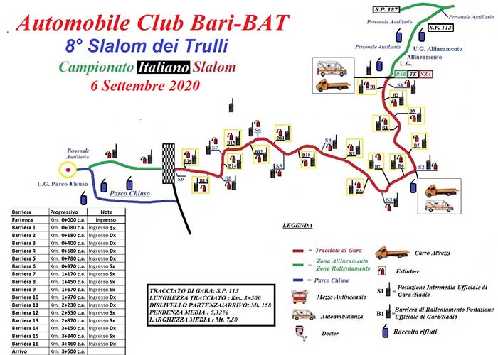 “Anche quest’anno, nonostante le limitazioni sanitarie legate all’emergenza Covid, l’Ac Bari Bat ha fortemente voluto che si svolgesse l’ottava gara dello ‘Slalom dei trulli’- ha dichiarato il presidente AC Bari Bat Francesco Ranieri-. Un appuntamento unico e molto apprezzato dagli sportivi di questa specialità in quanto il percorso è molto tecnico. La gara si svolgerà nel rigido rispetto dei protocolli di sicurezza sanitari e come sempre sportivi”.