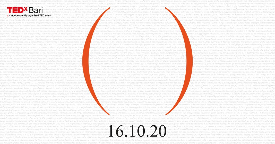 Venerdì 16 ottobre si svolgerà la quinta edizione del TEDxBari. ( ) o Parentesi è il tema di questa mini-edizione del TEDxBari 2020. Partendo da questa definizione, il TED talk di quest’anno chiederà ai suoi speaker cosa per loro voglia dire mettere il mondo tra “parentesi”, partendo dall’idea che le nostre vite, le generazioni, le epoche storiche sono costantemente intervallate da momenti di pausa, spesso secondo modalità che sembrano sfuggire al nostro controllo e alla nostra comprensione. A questa idea si aggiunge tuttavia l’impressione che, forse, proprio in quei momenti di pausa riusciamo a comprendere meglio le cose del mondo e noi stessi.
