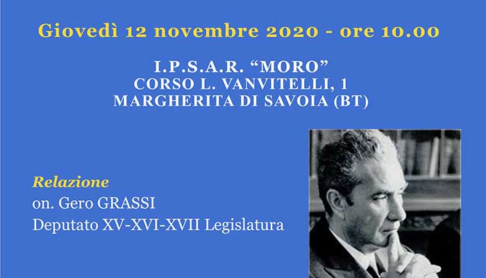 Domani alle ore 10.00, gli studenti dell’I.P.S.A.R. “Moro“ di Margherita di Savoia (BT) parteciperanno in streaming all’incontro per il progetto “Moro vive”, l’iniziativa del Consiglio regionale della Puglia che avvicina i giovani delle scuole superiori pugliesi al pensiero, al ruolo e alla figura dello statista di Maglie.