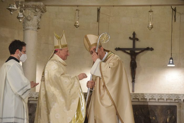 “La consegna del Pastorale – ha detto Cacucci – non è un semplice avvicendamento ma ti collega a Cristo e agli Apostoli. Il Pastorale che ti consegno raccoglie la ricchezza di grazia che si sprigiona dalla preghiera e santità del nostro popolo. Non è solo il vescovo a portare il pastorale ma è il pastorale stesso a portare il vescovo col quale guiderai il gregge di Dio e ti sosterrà nel cammino”. Un saluto al quale il nuovo arcivescovo Satriano ha voluto rispondere con “sentimenti di sincera gratitudine per la squisita gentilezza con cui ha vissuto e accompagnato questi giorni di preparazione all’inizio del mio ministero”. Un ringraziamento per gli anni spesi “a servizio di questa porzione di Chiesa a me già molto cara. – ha detto Satriano – Le sue parole mi aiutano a guardare avanti con fiducia, riprendendo a camminare nella gratitudine verso un passato che è sempre da riscoprire, come benedizione e luce per il presente”. Al termine della messa, infine, Satriano ha consegnato ai presbiteri un pezzo di pane e un’immagine del Crocefisso: “Il piccolo pezzo di pane portatelo nella vostra casa, beneditelo con una preghiera, condividetelo e donatelo. Sarà il gesto del condividere a benedire la vostra vita e la vita di chi riceverà questo segno di speranza”.