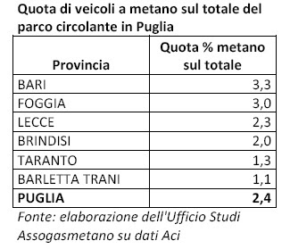 In Puglia i veicoli a metano sono il 2,4% dell’intero parco circolante. All’interno della regione è la provincia di Bari a detenere la maggior quota percentuale di veicoli a metano (3,3%) sul totale del parco circolante. Nella graduatoria delle province pugliesi, a Bari seguono Foggia (3%), Lecce (2,3%), Brindisi (2%), Taranto (1,3%) e Barletta Trani (1,1%). Sulla base di questi dati, si può dire che in Puglia la quota di veicoli a metano sul totale è minore rispetto alla media nazionale (2,1%).