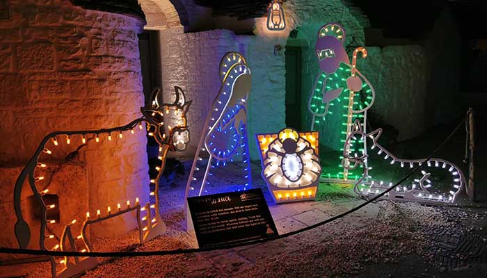 Oltre 30 figure realizzate, 12 punti di installazione. E’ il Presepe di Luce che illuminerà il rione Aia Piccola di Alberobello fino al 9 gennaio. Un percorso libero e gratuito all’interno del caratteristico Rione (uno dei cinque siti di Alberobello patrimonio dell’umanità e l’unico senza negozi), dove si potranno ammirare le installazioni luminose realizzate dalla associazione grazie alla collaborazione dei maestri della luce, Serena Lacarbonara e Francesco Ivone di LUMOS – illuminiamo le vostre idee.