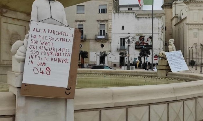 La scritta è di quelle che non lasciano dubbi interpretativi: una minaccia di pessimo gusto ed assolutamente inopportuna rivolto alla consigliera regionale Lucia Parchitelli è apparsa in piazza a Mola di Bari: “Alla Parchitelli che ha preso 500 voti a Mola gli auguriamo 500 possibilità di andare in uno 048”: il riferimento è al codice che si riferisce all’esenzione sanitaria per le malattie oncologiche.