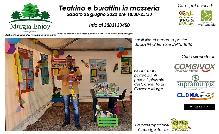 L’associazione “Murgia Enjoy“, in collaborazione con l’associazione cassanese “Storie e tradizioni delle Murge” proporrà uno spettacolo teatrale con burattini artigianali e racconti di favole della Murgia per donare allegria e gioia ai bambini.