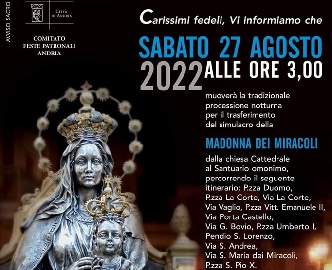 Sabato 27 agosto 2022, alle ore 3.00, per le strade di Andria si muoverà la tradizionale processione notturna per il trasferimento del simulacro della Madonna dei Miracoli, dalla Chiesa Cattedrale al Santuario omonimo, percorrendo il seguente itinerario: p.zza Duomo, p.zza La Corte, via La Corte, via Vaglio, p.zza Vittorio Emanuele II, via Porta Castello, via G. Bovio, piazza Umberto I°, Pendio San Lorenzo, via S. Andrea, via S. Maria dei Miracoli, piazza S.Pio X.
