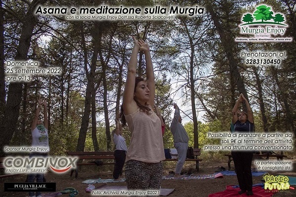 L’associazione Murgia Enjoy, con il fine di promuovere il territorio murgiano, di favorire una sana e moderata attività fisica, di creare momenti di socializzazione e di consentire la conoscenza di varie discipline, propone un’esperienza di Yoga Integrale sulla Murgia condotta dalla socia Dott.ssa Roberta Sciacovelli, laureata in fisioterapia, operatrice olistica e istruttrice yoga certificata CSEN.