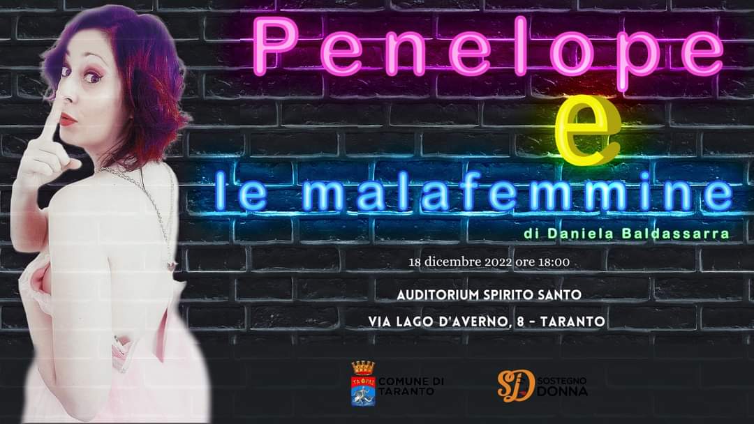 L’autrice e monologhista teatrale Daniela Baldassarra torna a Taranto con il suo nuovo spettacolo “Penelope e le malafemmine”. L’appuntamento è per domenica 18 dicembre, alle ore 18, all’auditorium Spirito Santo, in via Lago d’Averno. Organizzato dal Centro Antiviolenza “Sostegno Donna” attraverso i finanziamenti della Regione Puglia e patrocinato dal Comune di Taranto, l’evento prevede l’ingresso libero ma la prenotazione obbligatoria con messaggio WhatsApp al numero 3401086557. Prima dello spettacolo interverrà l’assessora ai Servizi sociali e Integrazione del Comune di Taranto, Maria Immacolata Riso.