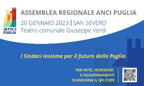 Il prossimo venerdì 20 gennaio 2023, dalle ore 10:00, presso il teatro comunale Giuseppe Verdi di San Severo, si terrà l’Assemblea regionale Anci Puglia, evento a cui parteciperanno sindaci e amministratori dei Comuni pugliesi, oltre a rappresentanti della politica e delle istituzioni locali e nazionali. (programma in aggiornamento).