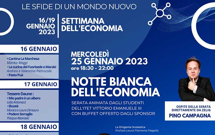 E c’è già aria di fervida attesa per l’arrivo della special guest star dell’appuntamento finale: Pino Campagna, comico e cabarettista foggiano di fama nazionale, uno dei volti principali del programma televisivo Zelig. A compimento della Settimana, infatti, mercoledì 25 gennaio prossimo, dalle ore 18.30 alle 22.00, l’I.T.E.T. di Lucera aprirà le sue porte alla “Notte Bianca dell’Economia”, ricca di laboratori, workshop e presentazione delle attività d’Istituto.
