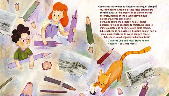 Non è facile spiegare la guerra, le difficoltà e le angosce che comporta, soprattutto se il nostro interlocutore è un bambino, quelle “verità scomode” che anche la Storia ha difficoltà a riportare nei libri di scuola. Temi sicuramente difficili da elaborare, ma che la Bartolo prova a fare attraverso il racconto, e toni adeguati alla loro età, per stimolare in loro la curiosità e l’approccio alla conoscenza di vicende che, se non per tutti, sicuramente per qualcuno, appartengono alla propria famiglia. “Matite Sbriciolate di nonno Antonio” è il “viaggio” tra i ricordi del Capitano che ha inizio con la scoperta di 34 disegni tratteggiati e colorati con “matite sbriciolate”, e che rappresentano la “storia della sua resistenza”. I protagonisti del libro sono due fratellini, Agata e Nicola che, per la prima volta, vengono a conoscenza delle ingiustizie vissute da nonno Antonio e dai tanti soldati prigionieri come lui, e da lì nasce in loro il desiderio di sapere di più. Tra il presente e passato, emozioni e riflessioni, il racconto arriva al cuore dei bambini con naturalezza, ma con altrettanta determinazione, supportata dalle importanti e delicate immagini dell’illustratrice Sara Mancuso, che rendono concretezza alla narrazione.