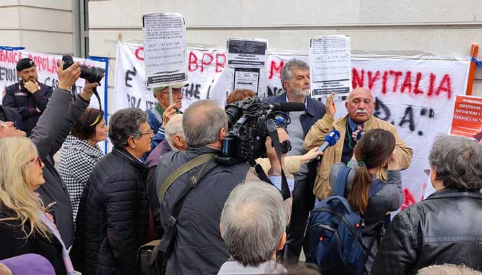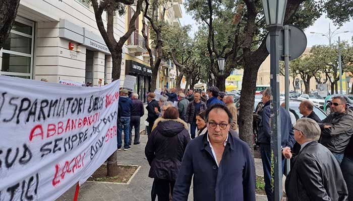 Si è svolta stamane sotto la sede di Bari della Banca Popolare di Bari una manifestazione di protesta dei soci della BPB, in concomitanza con l’assemblea degli azionisti.