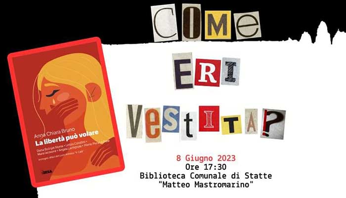 Dopo l’ultima presentazione di “La libertà può volare” all’interno del Centro Antiviolenza Li.A. ubicato in Palazzo Pinto a Sammichele di Bari lo scorso 31 maggio, la campagna promozionale prosegue con un nuovo appuntamento in agenda giovedì 8 giugno a Statte (TA), nell’ambito della mostra “Come eri vestita?” presso la Biblioteca Comunale “Matteo Mastromarino”.