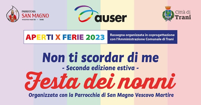 Per quattro giorni a Trani, dal 20 al 23 luglio, si festeggiano i nonni!. L’iniziativa “Non ti scordar di me” è organizzata dall’Auser Trani e dalla Parrocchia di San Magno Vescovo Martire per l’edizione estiva della Festa dei Nonni.