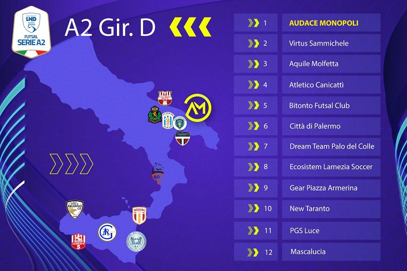 La Kredias Audace Monopoli, dopo la splendida scorsa stagione, debutterà per la prima volta nel campionato di Serie A2 girone D, insieme ad altri cinque club della Puglia, uno della Calabria e cinque della Sicilia. Un percorso tortuoso con diverse lunghe trasferte per i ragazzi allenati da mister Giacovazzo.