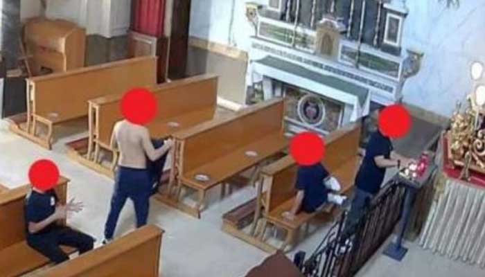 Il gruppo entra in una delle chiese più belle e antiche e pittoresche della città e la mettono a soqquadro urlando, denudandosi e bestemmiando tra i banchi sacri.
