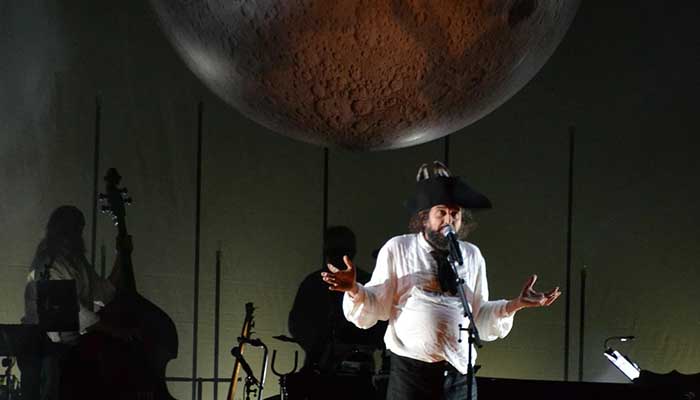 Sul palco, centrale come posizione e significato, una enorme luna bianca e rossa. A simboleggiare la tensione dell’uomo verso l’oltre, ma al tempo stesso una luna per cui sulla terra si perde il senno, ma al tempo stesso si sogna e ci si innamora.