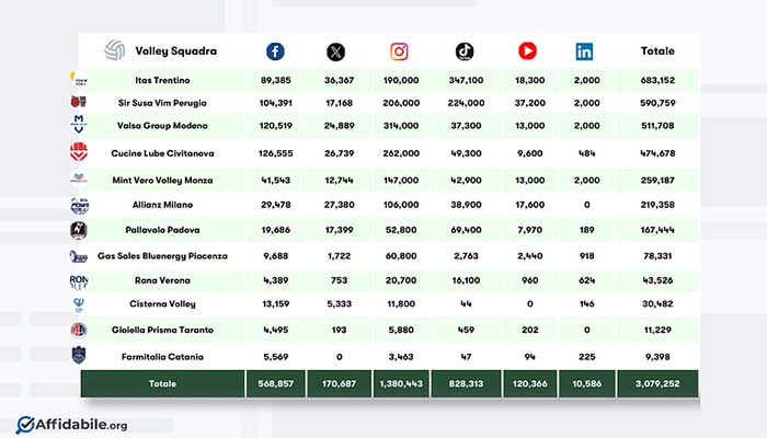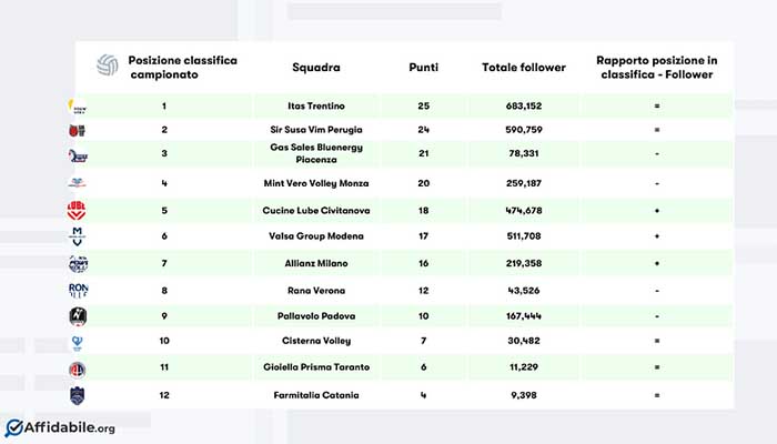 L’Itas Trentino, squadra di Trento fondata nel 2000, spicca con un considerevole numero di seguaci (683.152), al secondo posto l’altrettanto giovane società di Perugia (Sir Safety Conad Perugia), fondata nel 2001, con poco più di 590mila followers. Segue il Valsa Group Modena (511.708 fan sui social), società presente da più tempo nel panorama del volley (1966).