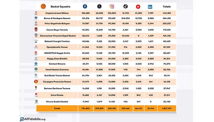 Sebbene si potesse pensare che anche l’anzianità di una squadra giocasse un ruolo chiave nel numero dei follower, l’esempio del Banco di Sardegna Sassari (264.301 followers), fondato negli anni ’60 come la Givova Scafati Basket (25.730), contraddice questa ipotesi, suggerendo che, forse, l’anzianità da sola non è il fattore determinante principale nel numero di seguaci.