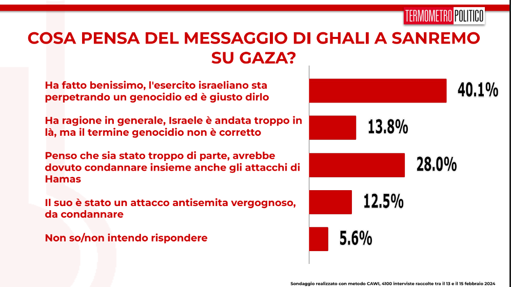 Il messaggio inviato da Ghali è stato ben accolto da un buon 40% del campione, affermando di aver fatto benissimo in quanto “l’esercito israeliano sta perpetrando un genocidio ed è giusto dirlo”. Poi, un 13,8% crede che abbia ragione in quanto Israele è andata troppo oltre, ma che non si può parlare di genocidio. Dall’altro lato, una minoranza (12,5%) crede che si tratti di un vergognoso attacco antisemita. Un 28% sostiene che Ghali sia stato troppo di parte e che avrebbe dovuto, al contempo, condannare l’attacco di Hamas del 7 ottobre.