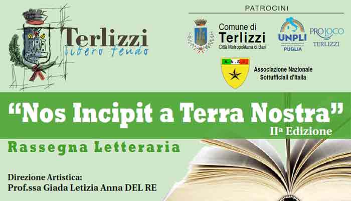 Via a Terlizzi la seconda edizione della rassegna letteraria Non incipit a terra nostra. Articolato in tre appuntamenti (ore 19:00), l’evento si svolgerà presso l’Aula Magna della scuola elementare “Don Pietro Pappagallo” ed è promosso dall’Associazione APS Terlizzi Libero Feudo di cui la direzione artistica della professoressa Giada Letizia Anna Del Re, con il patrocinio del Comune di Terlizzi, della Pro Loco Unpli Terlizzi e dell’Associazione Nazionale Sottoufficiali d’Italia.