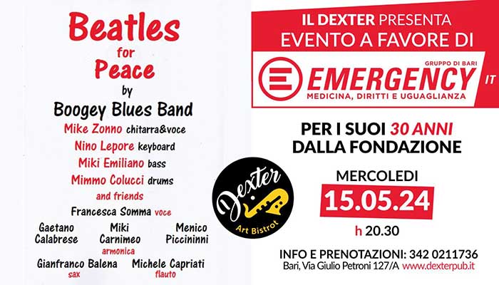L’evento BEATLES FOR PEACE si terrà al DEXTER questa sera 15/05/2024 dalle ore 20:30 – a BARI in via G. Petroni 127/A.
