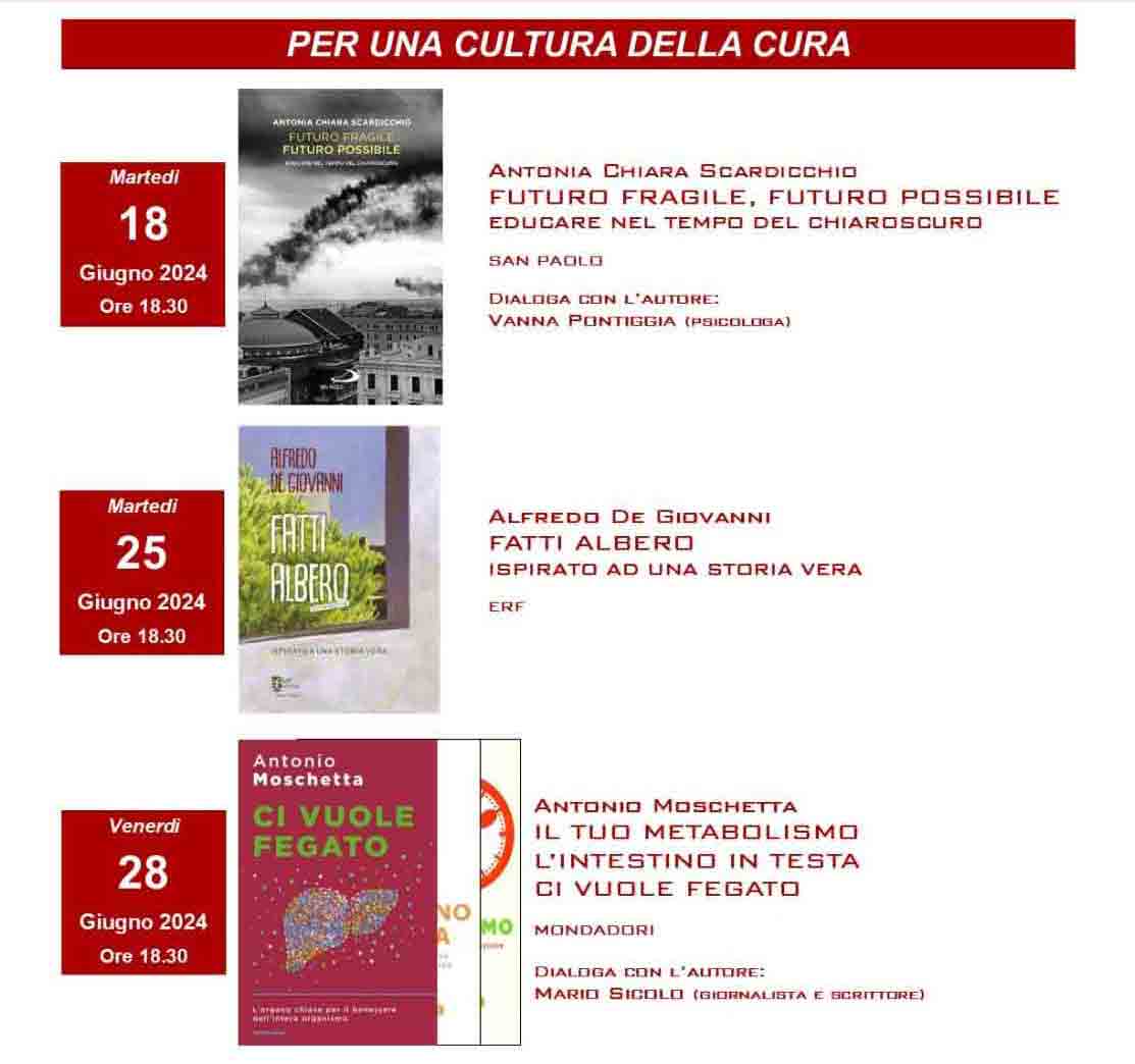 Ad aprire il capitolo della rassegna la professoressa specializzata in pedagogia Antonia Chiara Scardicchio che martedì 18 giugno presenterà “Futuro fragile, futuro possibile. Educare nel tempo del chiaroscuro” (San Paolo Edizioni). La docente dell’Università degli Studi di Bari Aldo Moro analizzerà l’odierna società, un presente critico caratterizzato da una guerra mondiale frammentata, un evidente cambiamento climatico e molteplici altre piaghe sociali per cui lavorare. Offrire degli strumenti corretti per interpretare il mondo e correggere, quanto meno nel nostro piccolo, la storia recente è la umile mission dell’autrice che saprà certo regalare in sede di dibattito spunti di riflessione per chi ha a cuore il futuro, per insegnanti, educatori, genitori e operatori pastorali che si prendono cura, per vocazione, della società del domani. A dialogare con la Scardicchio, la psicologa Giovanna Pontiggia.
