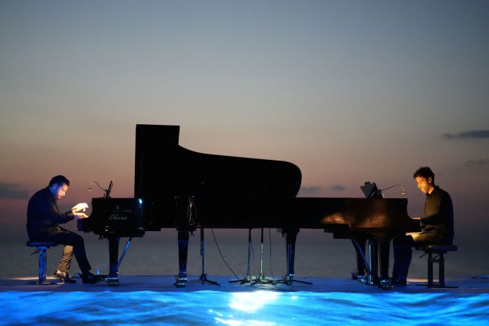 In attesa del primo sole sul Faro Verde, gli spettatori si sono lasciati cullare dalle letture e dai virtuosismi di due grandi maestri, come Alfonso Soldano e Giuseppe Greco, due solisti esibitisi in duo in una mirabile sintesi. I due talenti pugliesi già affermati, docenti titolari rispettivamente nei Conservatori di Stato “Niccolò Piccinni” di Bari e “Egidio Romualdo Duni” di Matera, hanno suonato due pianoforti gran coda da teatro, 176 tasti e 20 dita che si sono mosse all’unisono per creare un’esperienza unica.