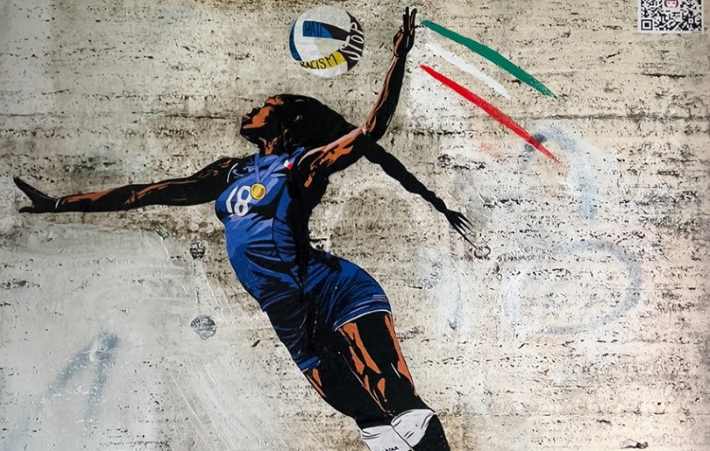 Il poster raffigura Paola Egonu, pallavolista della nazionale italiana neo campione olimpica che schiaccia un pallone su cui appare la scritta: “Stop razzismo, odio, xenofobia, ignoranza”.