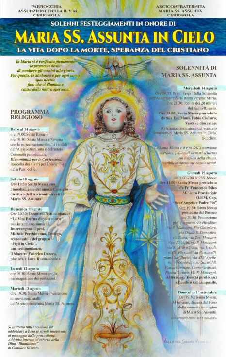 L’opera è stata donata alla Parrocchia B.V. M. Assunta di Cerignola. L’illustrazione è stata pubblicata sul manifesto che descrive il programma relativo ai festeggiamenti del 2024 e in occasione dell’insediamento del nuovo Consiglio di Amministrazione dell’Arciconfraternita Maria SS. Assunta in Cielo, il 10 Agosto 2024, è stata distribuita la nuova immaginetta che presenta questo capolavoro.