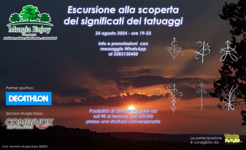 L’attività escursionistico-culturale che Murgia Enjoy proporrà sabato 24 agosto vuole permettere ai partecipanti di conoscere la simbologia del tatuaggio antico legato alle culture tribali e primitive. I partecipanti, inoltre, potranno conoscere le differenze tra il tatuaggio permanente e il tatuaggio ad hennè e sapere come scegliere il simbolo da tatuarsi. Il piacevole fresco tipico delle serate estive permetterà di godere appieno del contatto con la natura.