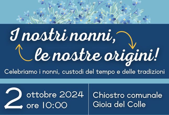 Il comune di Gioia del Colle omaggia i custodi del tempo e delle tradizioni, i pilastri delle nostre famiglie. In occasione della “Festa nazionale dei nonni”, in programma mercoledì 2 ottobre 2024, l’assessorato alle Politiche Sociali, in collaborazione con la Pro Loco di Gioia del Colle “Antonio Donvito” e con gli istituti comprensivi “Carano-Mazzini”, “Losapio-San Filippo Neri” e “Via Eva Gioia-Sammichele”, promuove l’evento dal titolo “I nostri nonni, le nostre origini”, che si svolgerà, a partire dalle ore 10:00, nel chiostro di Palazzo San Domenico (sede del comune di Gioia del Colle).