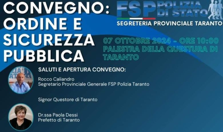 Proprio il sottosegretario al ministero dell’Interno, Nicola Molteni, sarà fra i relatori dell’incontro, che avrà inizio alle ore 10 presso la Questura di Taranto e sarà moderato dalla giornalista Elena Ricci. Il convegno si aprirà con i saluti del Segretario provinciale Fsp Taranto, Rocco Caliandro, del prefetto, Paola Dessì, del neo questore, Michele Davide Sinigaglia, mentre gli altri relatori saranno l’onorevole Ciro Maschio, presidente della II Commissione Giustizia alla Camera; Giovanni Maiorano, componente della IV Commissione Difesa; Fabio Abis, Dirigente superiore della Polizia di Stato – direttore del Servizio Reparti speciali; Fabrizio Lotti, Segretario generale aggiunto Fsp con delega all’Ordine pubblico; e lo stesso Mazzetti.
