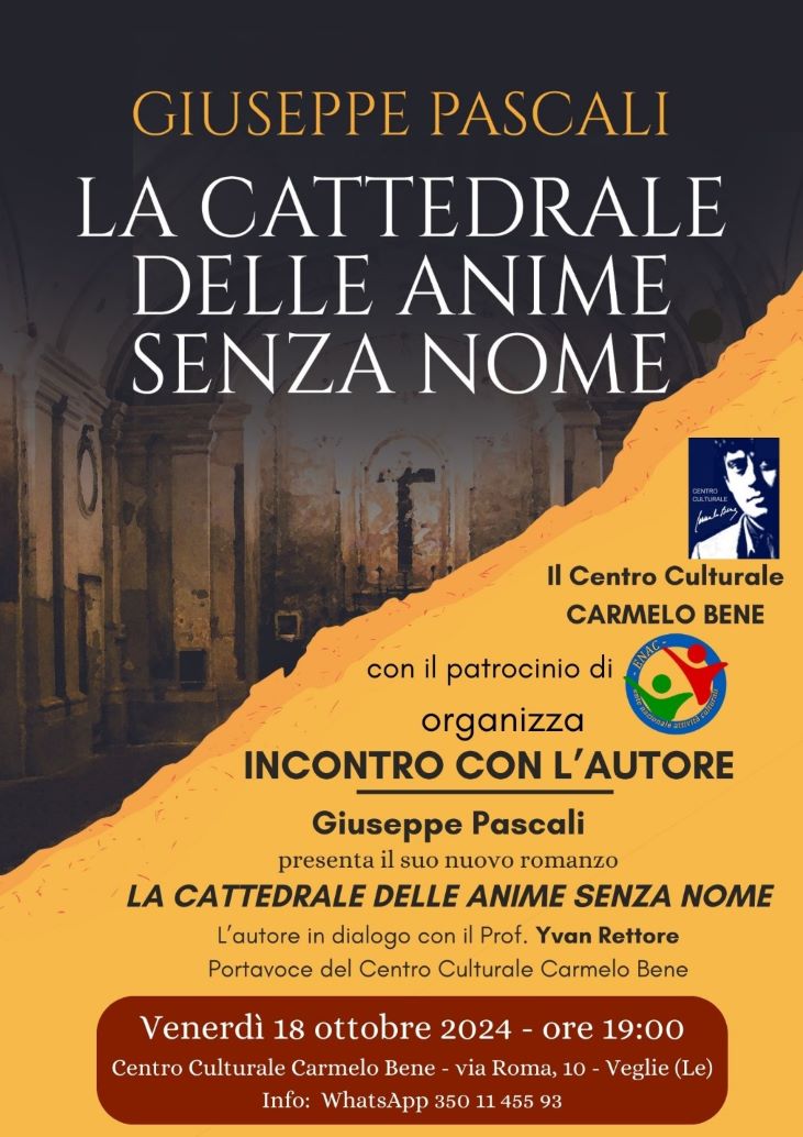 Il 18 ottobre prossimo, presso la sede del Centro Culturale Carmelo Bene di Veglie, verrà presentato  l’ultimo romanzo di Giuseppe Pascali, dal titolo “La Cattedrale delle anime senza nome”.
