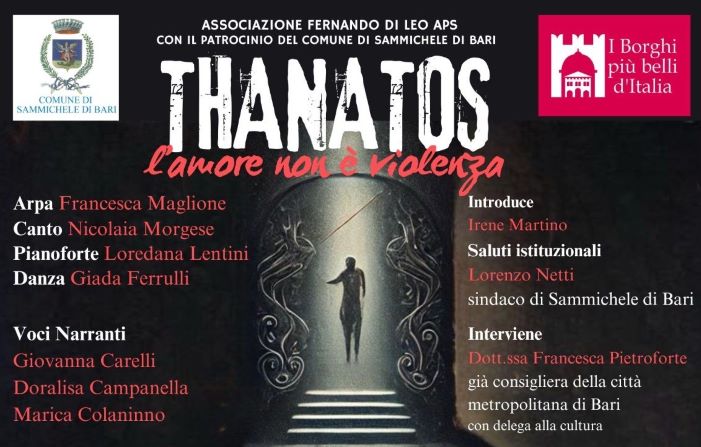 L’Associazione Culturale “Fernando di Leo APS” in collaborazione con il Comune di Sammichele di Bari promuove una pièce artistica multidisciplinare dal titolo: “Thanatos – l’amore non è violenza”, per favorire la sensibilizzazione sul tema della violenza di genere.