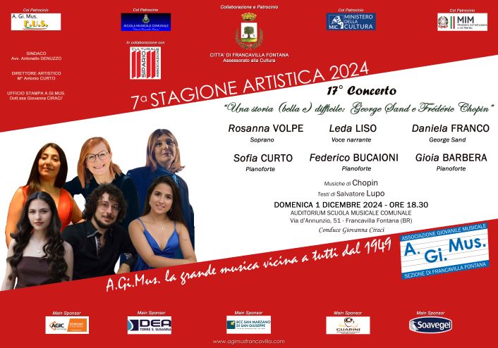 La figura di Chopin al pianoforte è affidata a tre musicisti: Federico Bucaioni, Gioia Barbera e Sofia Curto che eseguiranno 12 brani musicali, uno dei quali impreziosito dalla voce del soprano Rosanna Volpe. George Sand sarà interpretata da Daniela Franco, mentre la Voce narrante è affidata a Leda Liso. Il concerto verrà eseguito in anteprima sabato 30 novembre, presso la stessa Scuola Musicale Comunale, per gli studenti del Liceo Scientifico Statale “Ribezzo” di Francavilla Fontana, diretto dalla Preside Giuseppina Pagano.