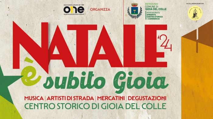 Il Natale a Gioia del Colle quest’anno sarà un’esperienza straordinaria di tradizioni, luci, musica e solidarietà. Con il progetto “Natale è subito Gioia”, l’Associazione Culturale ONE – Organizzazione Nuovi Eventi, in collaborazione con il “Comitato Centro Storico – Gioia del Colle” e con il patrocinio del Comune di Gioia del Colle, Assessorato Ambiente, Centro Storico e Commercio, invita cittadini e visitatori a vivere un periodo natalizio unico, celebrando le bellezze storiche della città e promuovendo valori di comunità, arte e rispetto per l’ambiente.