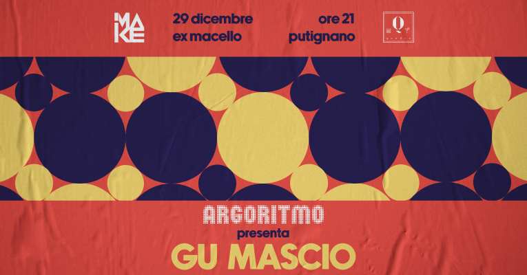 Domenica 29 dicembre con inizio alle ore 21 presso I Make EX MACELLO in Via S. Caterina da Siena, snc, 70017 Putignano BA ARGORITMO presenta GU MASCIO, uno dei DJ più apprezzati della scena underground italiana.