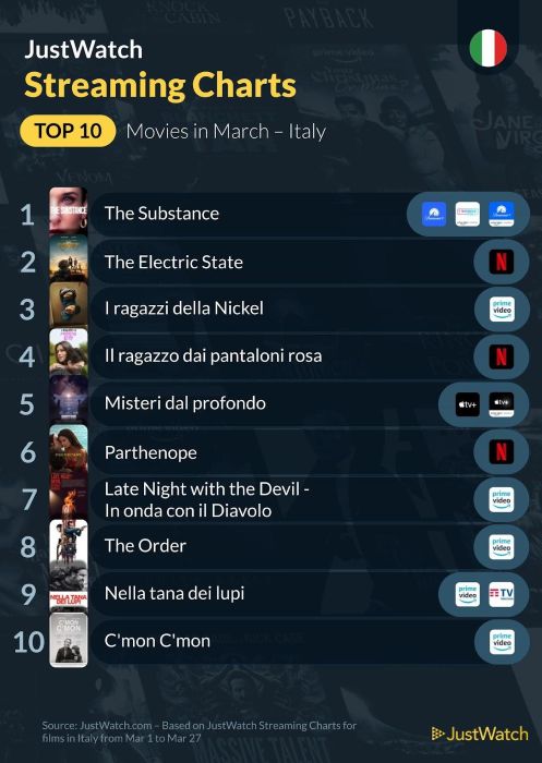 A marzo 2025, la classifica dei film più popolari in Italia vede “The Substance” conquistare la vetta, seguito da “The Electric State” e “I ragazzi della Nickel”.