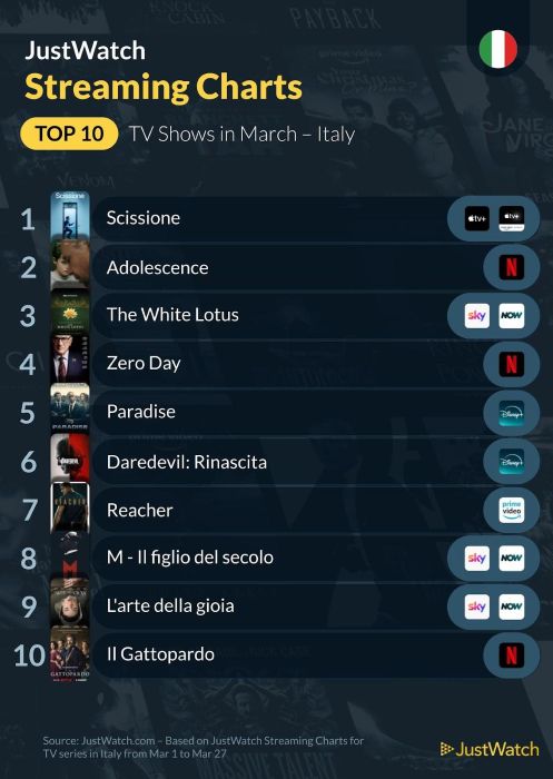 A marzo 2025, la classifica delle serie TV più popolari in Italia vede “Scissione” conquistare la vetta, seguito dalla discussissima “Adolescence” e “The White Lotus”.