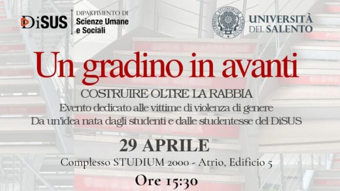 Il Dipartimento di Scienze Umane e Sociali dell’Università del Salento (DiSUS) promuove “Un gradino in avanti. Costruire oltre la rabbia”, un’iniziativa ideata dalle studentesse e dagli studenti del Dipartimento e dedicata al tema della violenza di genere, con l’obiettivo di stimolare riflessione, consapevolezza e responsabilità collettiva.