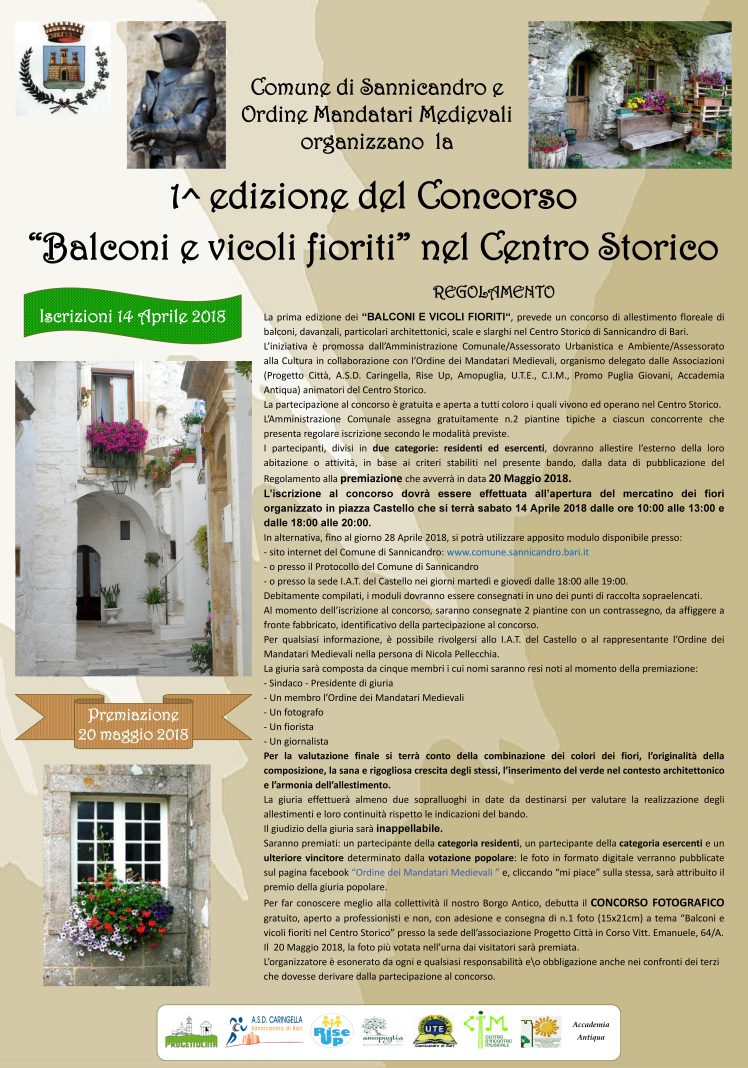 Balconi e vicoli fioriti di Sannicandro di Bari è alla sua prima edizione. Dal 14 al 28 aprile scorso i cittadini sannicandresi hanno potuto iscriversi al concorso e allestire le vetrine e i balconi fioriti del proprio borgo antico. L’organizzazione dell’Ordine dei mandatari medioevali ha fornito loro due piccole piante, tutto il resto lo hanno messo i partecipanti. In molti la passione perle piante l’avevano già ed il loro balcone o esercizio commerciale era già “verde”, altri hanno preso spunto da questa iniziativa per dare un tocco di colore e natura alla propria attività o residenza.
