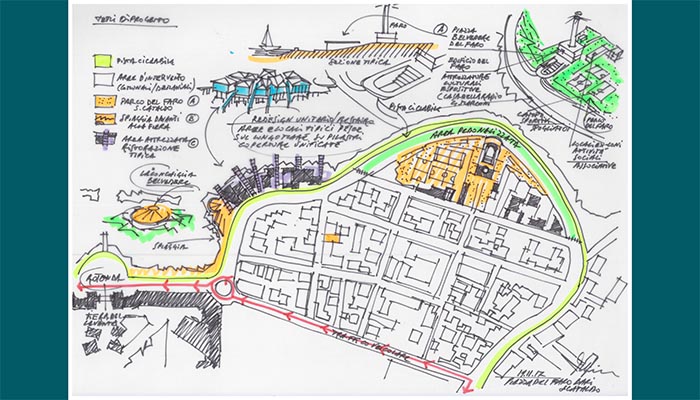 • la risistemazione e l’integrazione (campi di bocce, ecc.) degli impianti sportivi esistenti al fine di guadagnare spazio per il parco e aumentare la permeabilità del suolo.