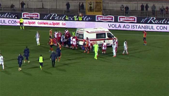 La situazione, dicevamo, appare grave. Il secondo intervento dei soccorsi, con l’ambulanza, è ancora in corso. Passano i minuti. I giocatori sono riuniti intorno al loro collega. Gli sguardi, gli atteggiamenti, i movimenti comunicano tensione e paura. Quando l’orologio dello stadio indica i 12 minuti l’ambulanza lascia il terreno di gioco, passando sotto al settore dei tifosi ascolani che accolgono la vettura tra gli applausi, e successivamente abbandona il Via del Mare. Destinazione Vito Fazzi. Da questo momento le notizie che arrivano sono confortanti. Il giocatore è vigile e viene trasportato in ospedale in Codice Giallo.
