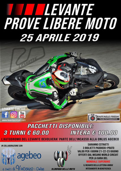 Motori, cuore, passione e solidarietà. Saranno queste le parole chiave delle Prove Libere all’Autodromo del Levante di Binetto (Ba), domani 25 aprile 2019. L’evento, organizzato da Lorenzo Rognoni, presidente delle prime Olimpiadi delle Moto in programma a Saragoza nel 2020, da A.Ge.B.E.O., l’associazione di Michele Farina che si occupa di ospitare e assistere le famiglie dei bambini ammalati di leucemia e dall’Autodromo del Levante di Binetto, mira a raccogliere fondi per la costruzione del Villaggio dell’Accoglienza che Agebeo sta realizzando a Bari, alla I° traversa di via Camillo Rosalba, per accogliere e ospitare le famiglie con bambini ammalati di leucemia.