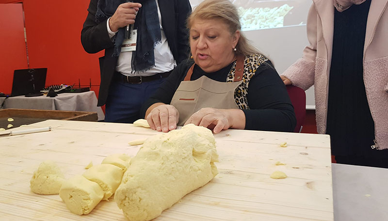 Tra risate e confidenze la signora Nunzia di Bari Vecchia, ormai una vera celebrità, ci ha spiegato come si fanno le orecchiette e “l strascinat” baresi. Ha cominciato con il raccontare della sua infanzia nel “sottano” di Bari Vecchia, in cui sua nonna la costringeva fin da bambina ad impastare, affinché imparasse da subito un lavoro. É un mestiere artigiano della nostra tradizione che si sta perdendo, per questo per Nunzia é importante che le nuove generazioni lo imparino. La Signora ci racconta anche che tantissime persone, fra cui anche chef famosi, hanno provato ad imparare da lei i trucchi del mestiere. “L strascinat” (gli strascinati), sono chiamati così perché si trascinano, si tirano sul tavoliere per dare la consistenza giusta per trattenere il condimento.