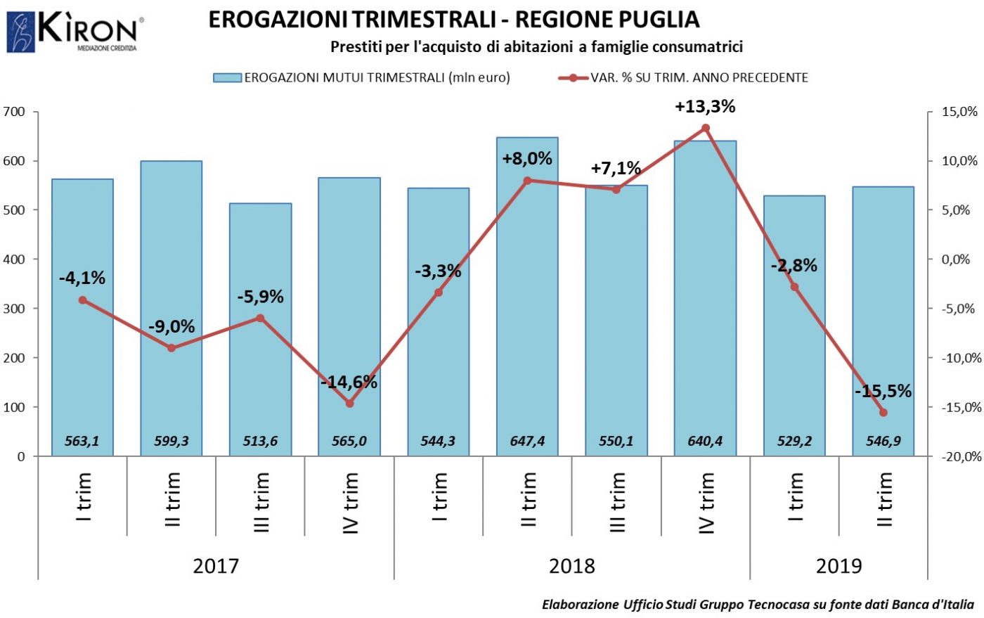 Le famiglie pugliesi hanno ricevuto finanziamenti per l’acquisto dell’abitazione per 546,9 milioni di euro, che collocano la regione all’ottavo posto per totale erogato in Italia, con un’incidenza del 4,65%; rispetto allo stesso trimestre dell’anno precedente in regione si registra una variazione delle erogazioni pari a -15,5%, per un controvalore di -100,5 milioni di euro.